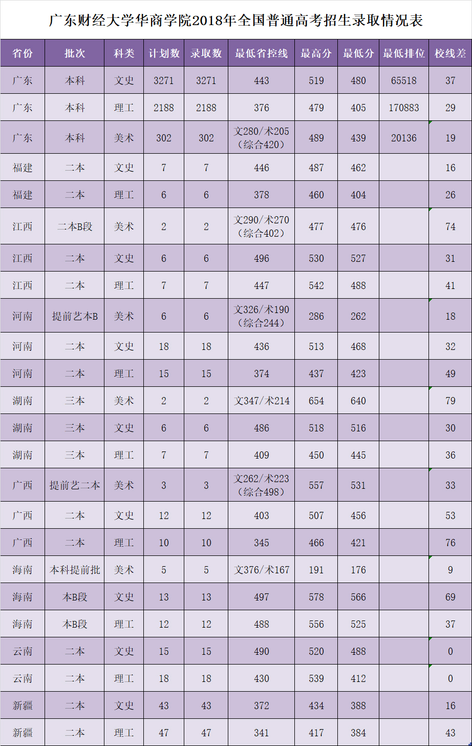 今年我院在广东省内投档线和最低排位大幅度提升,生源质量也进一步提高。投档分:文科投档最低480分,超过本科线37分,最低排位65518,比去年提升4427名;理科投档最低405分,超过本科线29分,最低排位170883;美术类投档(综合分)最低439分,超过本科综合线19分,最低排位20136。