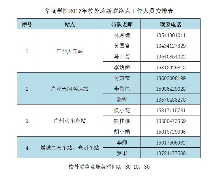 为方便乘坐火车或大巴车的小鲜肉及家长们安全快捷到达华商,学校在广州火车站、广州火车东站、广州天河客运站,广州增城二汽车站和光明车站设立了校外迎新联络点,并为考生和家长们提供免费到校直通车服务。