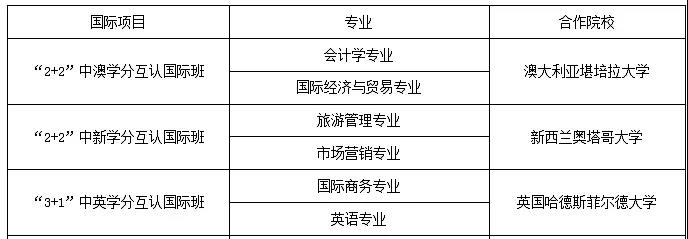 华商学院国际学院分别与澳大利亚堪培拉大学、英国哈德斯菲尔德大学、新西兰奥塔哥大学等海外高校开展联合培养双学位项目,目前已开设6个本科专业,具体如下: