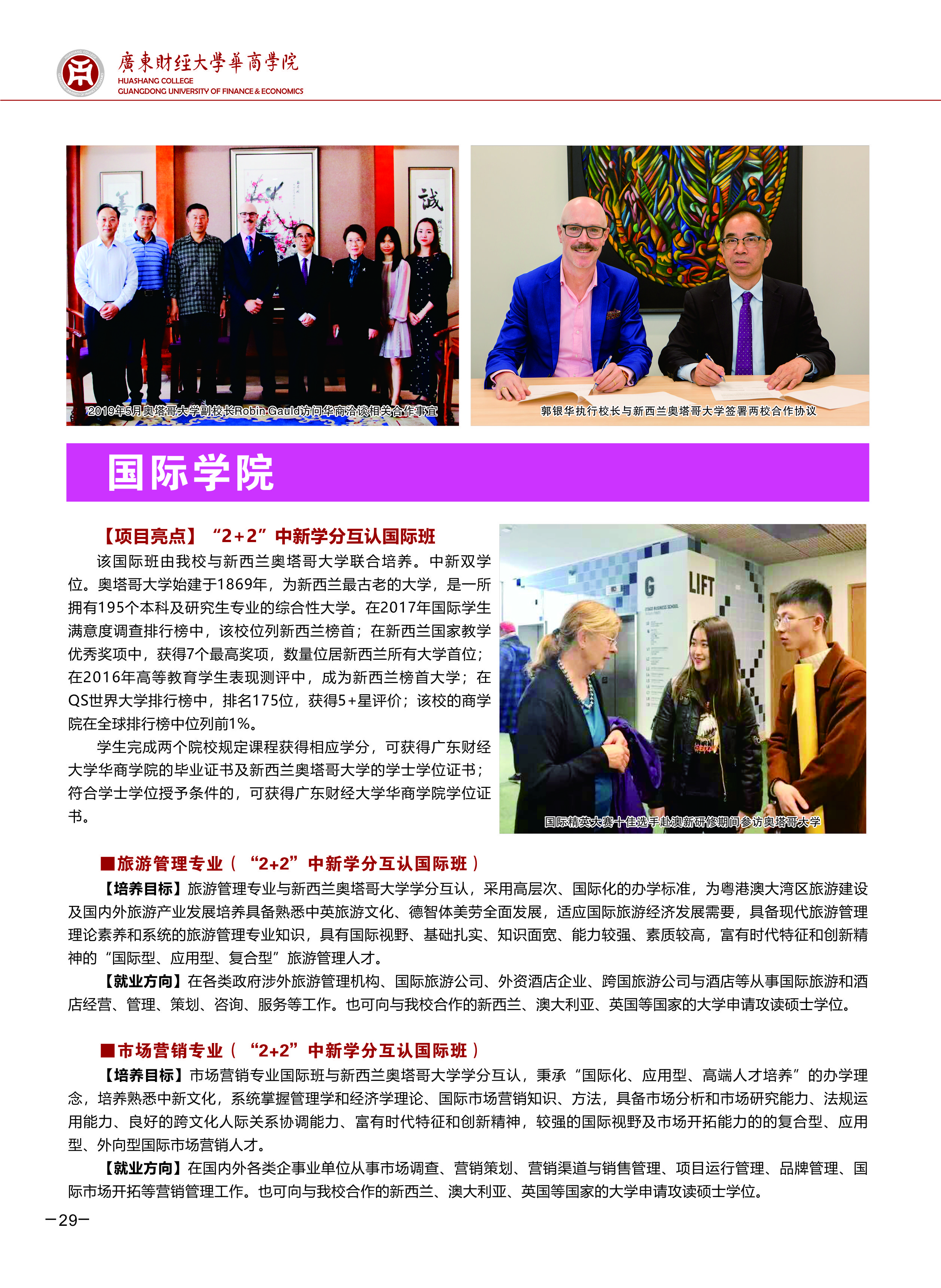 下面为大家介绍一下与新西兰奥塔哥大学开展学分互认项目。完成所有规定课程,你将获得:广东财经大学华商学院毕业证书,新西兰奥塔哥大学学士学位证书,广东财经大学华商学院学士学位证书。