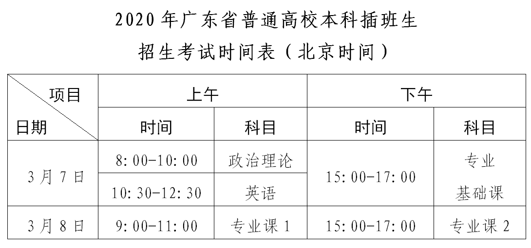 (五)普通高校本科插班生招生考试时间为2020年3月7日(星期六)至8日(星期日)两天,具体安排见下表: